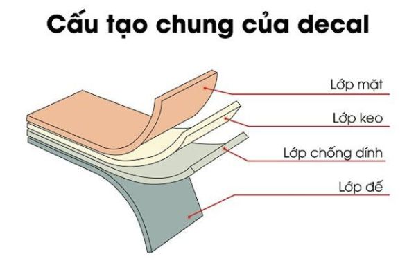 1. Decal/tem là “vật liệu mặt” + “keo” + “đế”