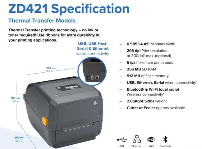 Thông số kỹ thuật tiêu biểu Máy in tem Zebra ZD421