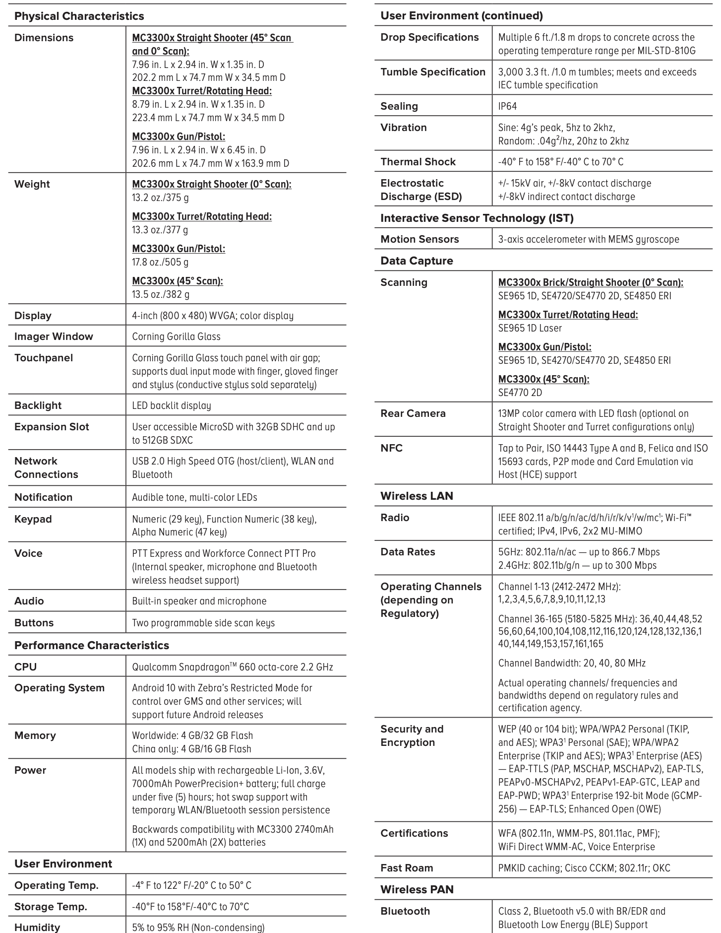 - MC3300 được sản xuất theo tiêu chuẩn IP64, chống bụi và tia nước, đồng thời chịu được va đập rơi từ độ cao 1.5 mét xuống sàn bê tông.