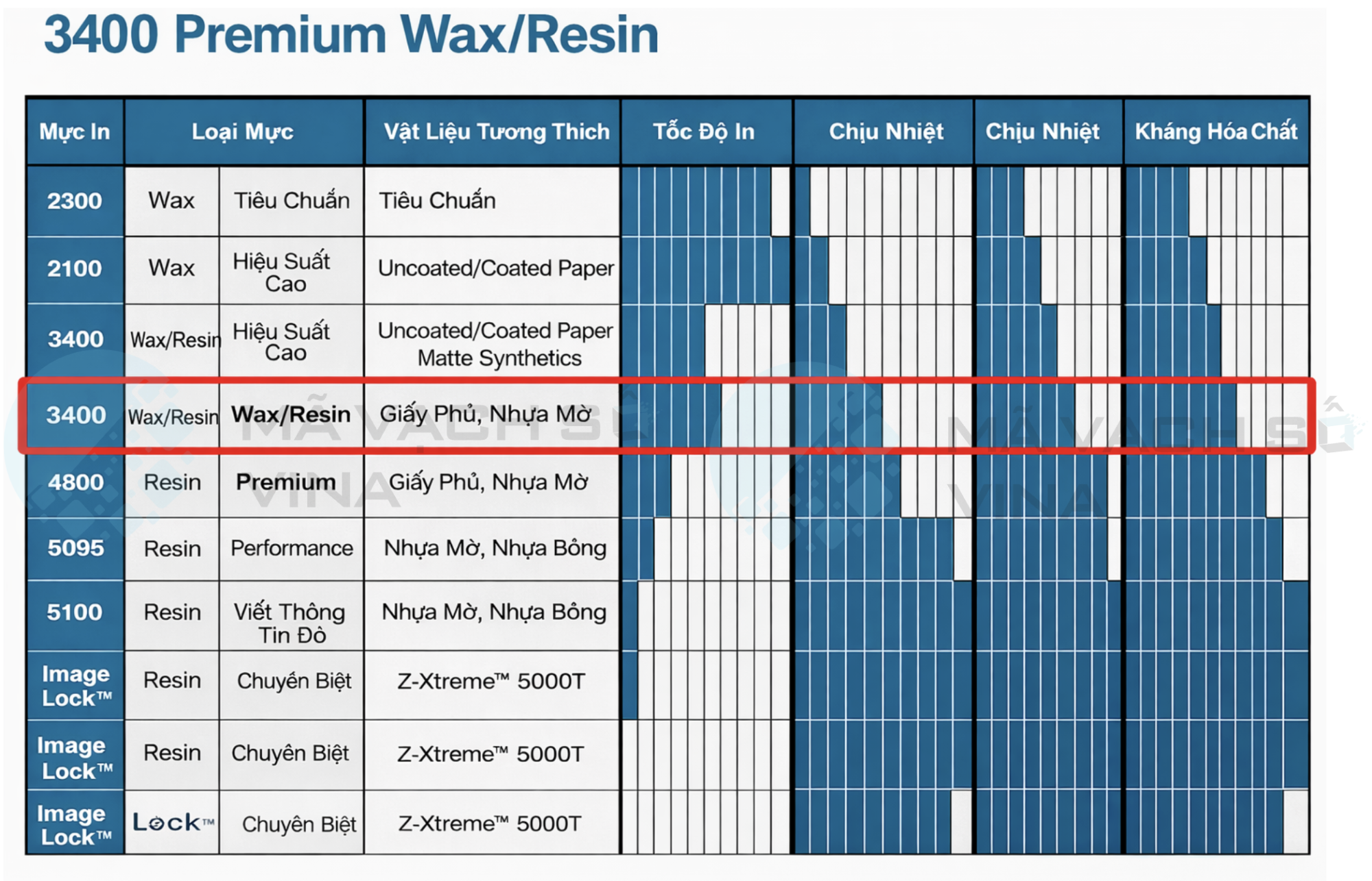 So sánh Mực in tem nhãn decal mã vạch Zebra Wax Resin 3400 với các loại ribbon khác