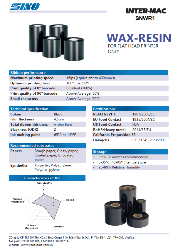 - INTER-MAC SNWR1 là dòng ribbon Wax Resin cao cấp, sản xuất tại Singapore tiêu chuẩn quốc tế, thiết kế riêng cho nhu cầu in tem nhãn: + Độ bền cao + Khả năng chịu ma sát + Chống nước + Chống hóa chất nhẹ + Màu in sắc nét, không phai