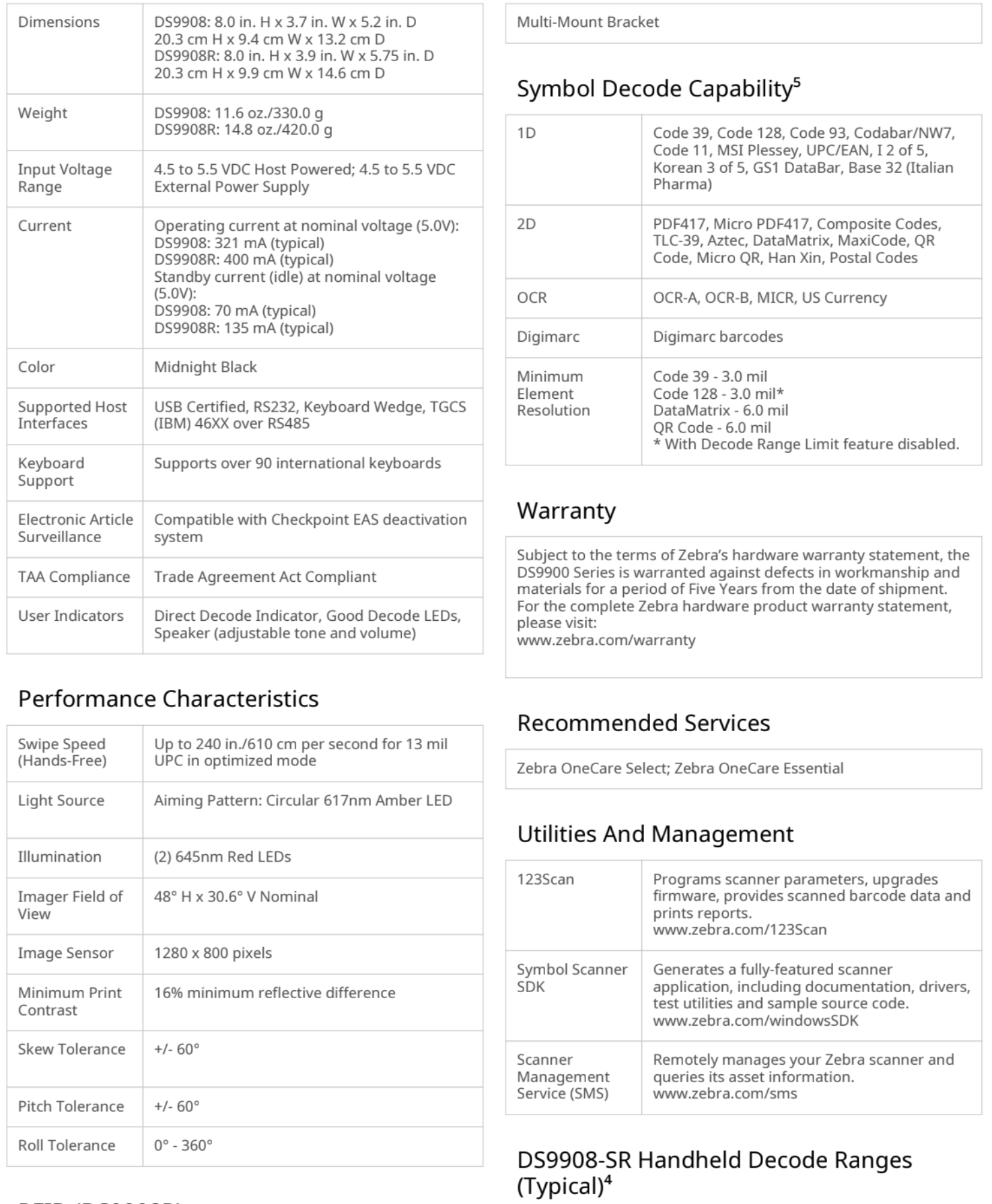 Thông số kỹ thuật Máy quét mã vạch Zebra DS9908