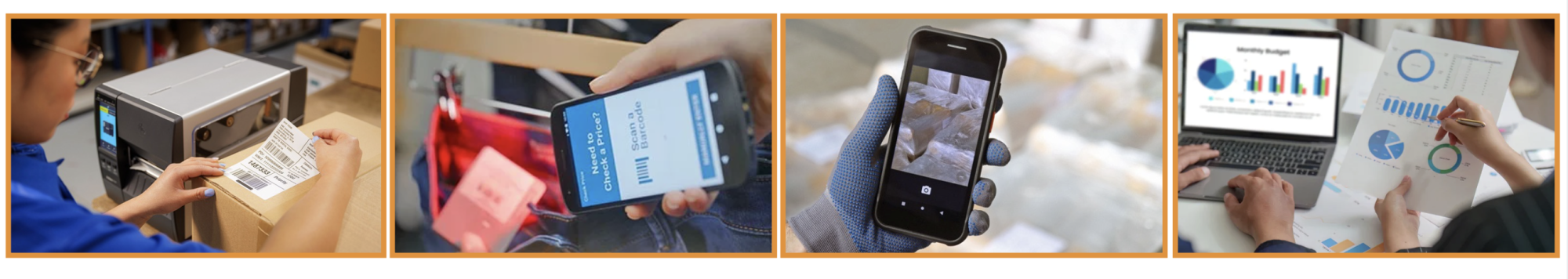 | Bước 1: Dán tem mã vạch | Bước 2: Quét mã nhập kho | Bước 3: Quản lý vị trí | Bước 4: Xuất kho, kiểm kê |