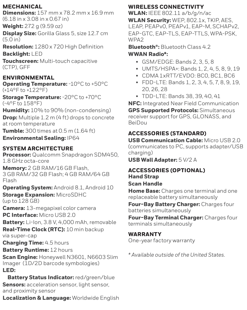 Thông Số Kỹ Thuật của Máy Kiểm Kho PDA Honeywell EDA51