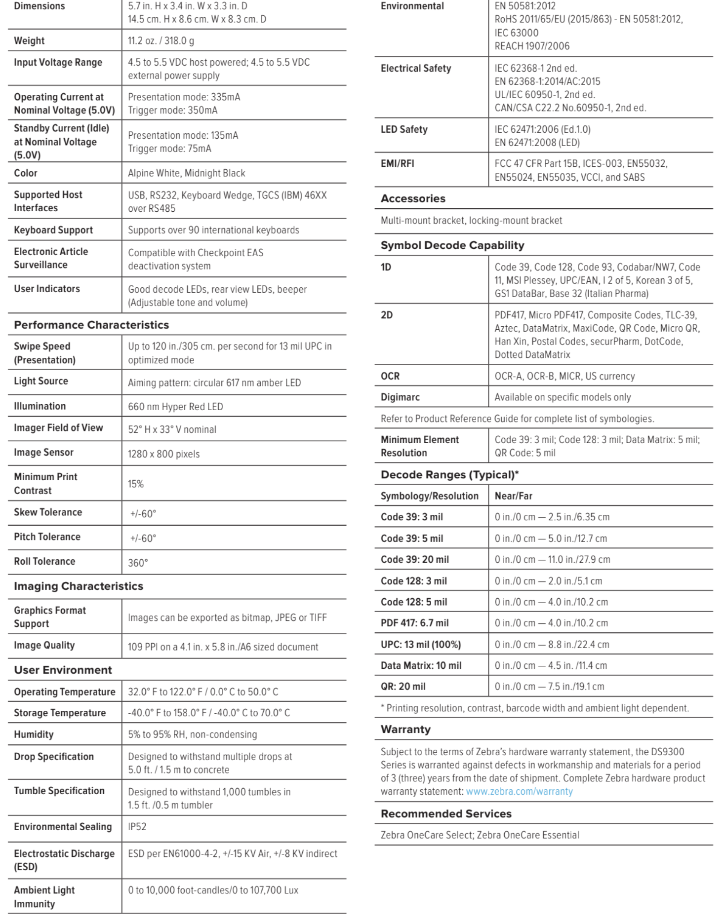 Thông số kỹ thuật Máy quét mã vạch Zebra DS9308