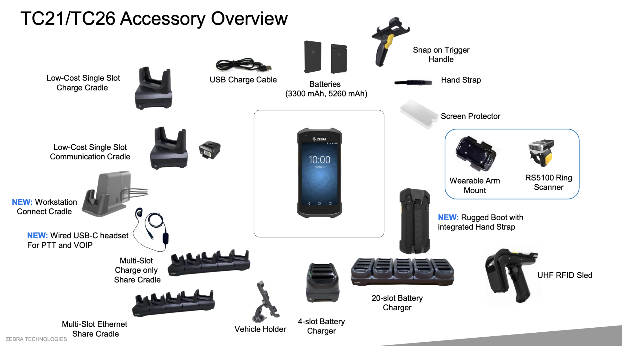 Zebra TC21 hỗ trợ nhiều phụ kiện mở rộng như: